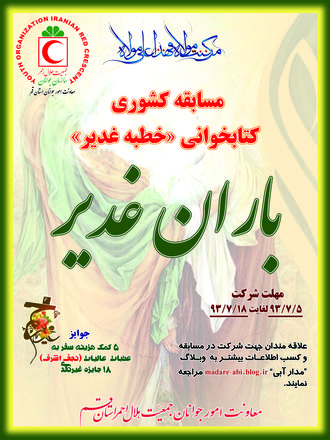 به گزارش روابط عمومی سازمان جوانان همزمان با عید بزرگ غدیر خم، عیدالله اکبر معاونت امور جوانان جمعیت هلال احمر استان قــم از مسابقه کشوری کتابخوانی خطبه غدیر را با نام بـــاران غدیـــــــر خبر داد.